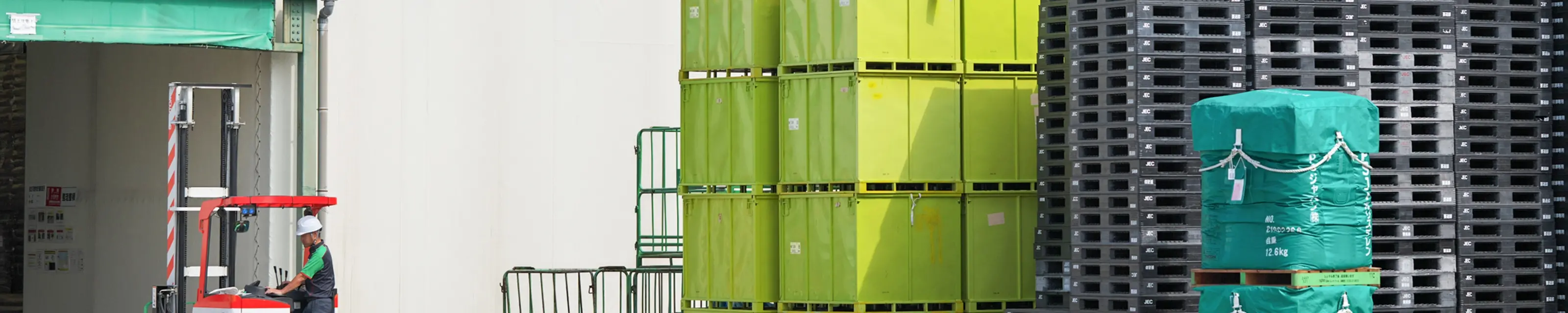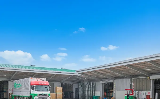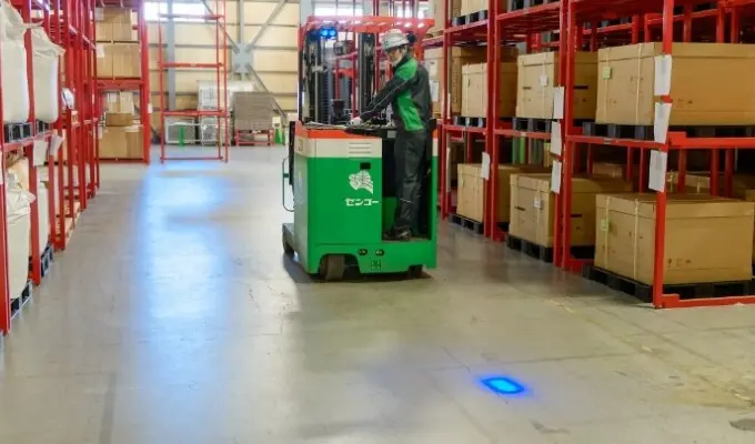 倉庫では保管商品により死角が生まれ、人とフォークリフトが接触するリスクが潜んでいることから、フォークリフトの存在を光で知らせるアーチライトを導入。騒音や死角の多い倉庫でも接触事故を未然に防ぎます。